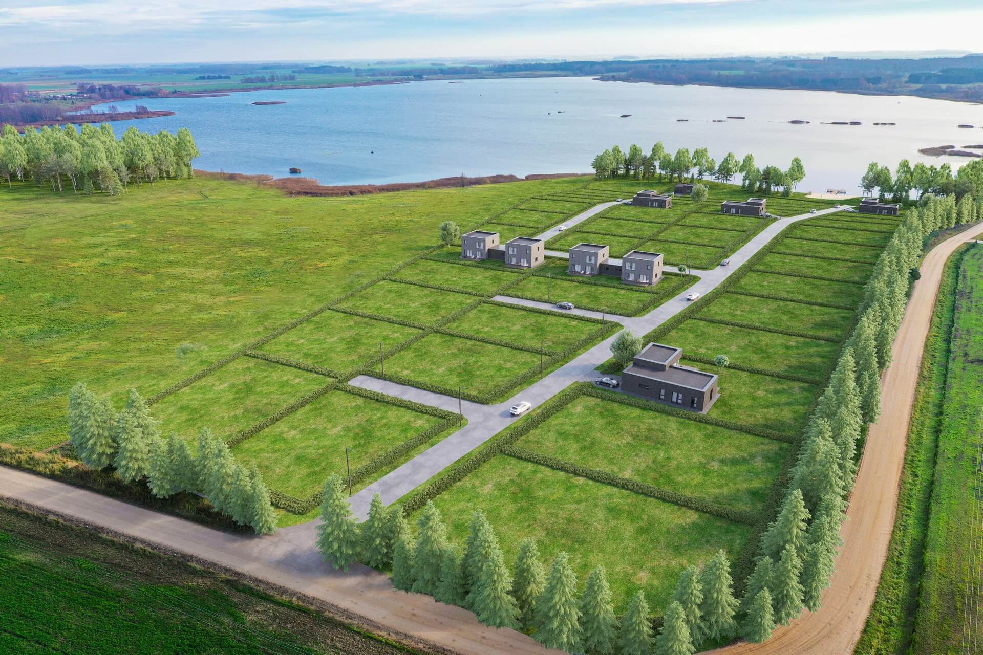 Daugiau privatumo: Sklypų kraštinės palei gatvę apsodintos pušimis, sukuriančiomis jaukią ir atskirtą aplinką.